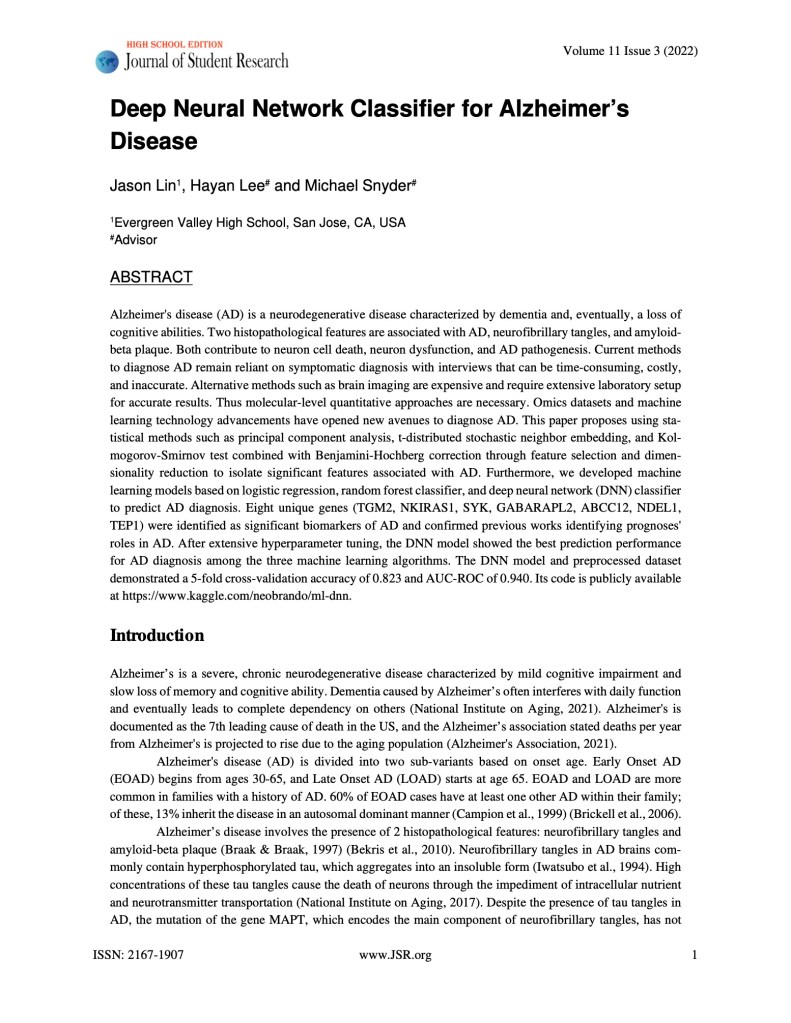 Lin J, Lee H, Snyder M. Deep Neural Network Classifier for Alzheimer’s Disease. J Stud Res 2022;11.