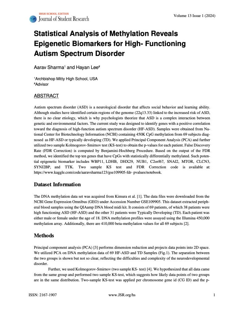 Sharma A, Lee H, Statistical analysis of methylation reveals epigenetic biomarkers for high-functioning autism spectrum disorder. Journal of Student Research. 2024.
