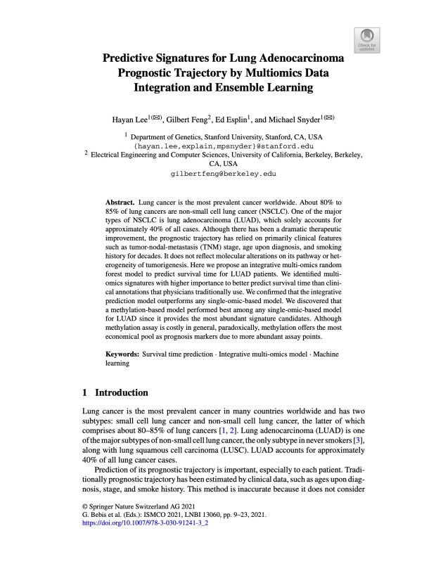 Lee H, Feng G, Esplin E & Snyder M. Predictive Signatures for Lung Adenocarcinoma Prognostic Trajectory by Multiomics Data Integration and Ensemble Learning. in Mathematical and Computational Oncology 9–23 (Springer International Publishing, 2021)