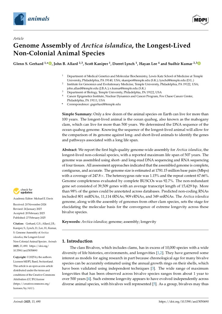 Gerhard GS, Allard JB, Kaniper S, Lynch D, Lee H, Kumar S. Genome Assembly of Arctica islandica, the Longest-Lived Non-Colonial Animal Species. Animals. Multidisciplinary Digital Publishing Institute; 2025 Feb 27;15(5):690.