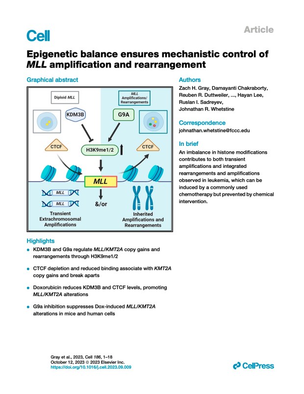 Gray ZH, Chakraborty D, Duttweiler RR, Alekbaeva GD, Murphy SE, Chetal K, Ji F, Ferman BI, Honer MA, Wang Z, Myers C, Sun R, Kaniskan HÜ, Toma MM, Bondarenko EA, Santoro JN, Miranda C, Dillingham ME, Tang R, Gozani O, Jin J, Skorski T, Duy C, Lee H, Sadreyev RI, Whetstine JR. Epigenetic balance ensures mechanistic control of MLL amplification and rearrangement. Cell. 2023 Oct 12;186(21):4528–4545.e18. PMCID: PMC10591855