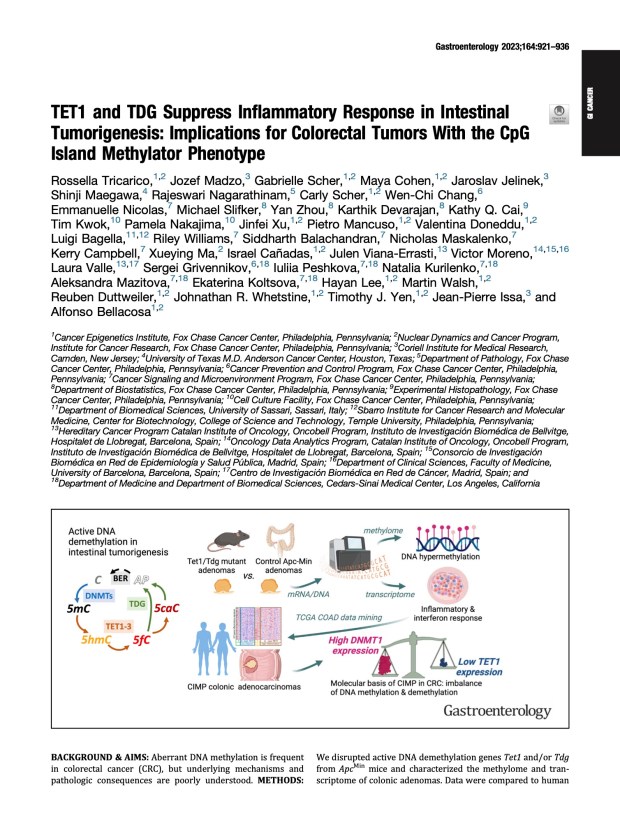 Tricarico R, Madzo J, Scher G, Cohen M, Jelinek J, Maegawa S, Nagarathinam R, Scher C, Chang WC, Nicolas E, Slifker M, Zhou Y, Devarajan K, Cai KQ, Kwok T, Nakajima P, Xu J, Mancuso P, Doneddu V, Bagella L, Williams R, Balachandran S, Maskalenko N, Campbell K, Ma X, Cañadas I, Viana-Errasti J, Moreno V, Valle L, Grivennikov S, Peshkova I, Kurilenko N, Mazitova A, Koltsova E, Lee H, Walsh M, Duttweiler R, Whetstine JR, Yen TJ, Issa JP, Bellacosa A. TET1 and TDG Suppress Inflammatory Response in Intestinal Tumorigenesis: Implications for Colorectal Tumors With the CpG Island Methylator Phenotype. Gastroenterology. 2023 Feb 8:S0016-5085(23)00112-9. doi: 10.1053/j.gastro.2023.01.039. Epub ahead of print. PMID: 36764492.