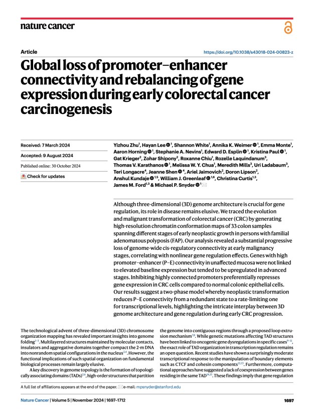 Zhu Y, Lee H, White S, Weimer AK, Monte E, Horning A, Nevins SA, Esplin ED, Paul K, Krieger G, Shipony Z, Chiu R, Laquindanum R, Karathanos TV, Chua MWY, Mills M, Ladabaum U, Longacre T, Shen J, Jaimovich A, Lipson D, Kundaje A, Greenleaf WJ, Curtis C, Ford JM, Snyder MP. Global loss of promoter-enhancer connectivity and rebalancing of gene expression during early colorectal cancer carcinogenesis. Nat Cancer. Nature Publishing Group; 2024 Oct 30;1–16. PMID: 39478119