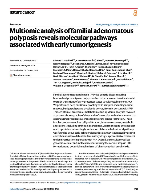 Esplin ED, Hanson C, Wu S, Horning AM, Barapour N, Nevins SA, Jiang L, Contrepois K, Lee H, Guha TK, Hu Z, Laquindanum R, Mills MA, Chaib H, Chiu R, Jian R, Chan J, Ellenberger M, Becker WR, Bahmani B, Khan A, Michael B, Weimer AK, Esplin DG, Shen J, Lancaster S, Monte E, Karathanos TV, Ladabaum U, Longacre TA, Kundaje A, Curtis C, Greenleaf WJ, Ford JM, Snyder MP. Multiomic analysis of familial adenomatous polyposis reveals molecular pathways associated with early tumorigenesis. Nat Cancer. 2024 Nov;5(11):1737–1753. PMCID: PMC11584401
